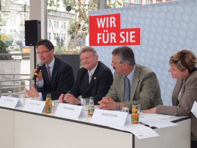 Von links nach rechts: Ralf Schütte (Bereichsleiter BDC, CRM und Marketing-Kommunikation LUEG AG), Friedel Thiele (Vorsitzender Fahrlehrerverband Westfalen), Kurt Bartels (Stellv. Vorsitzender Fahrlehrerverband Nordrhein), Astrid Ernst (Mercedes-Benz Driving Academy)