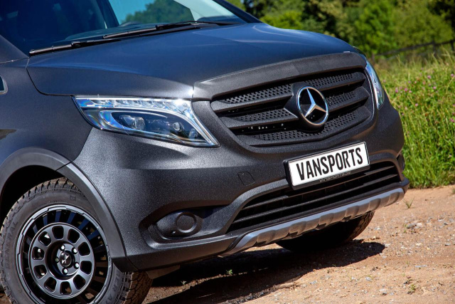 Den werksseitigen Kraxel-Talenten des Allrad-Vitos leistet die auf die technische und optische Individualisierung von V-Klasse, Vito, Sprinter und Co. spezialisierte VANSPORTS-Mannschaft aus Neuss mittels der Installation eines Höherlegungsfedersatzes samt spezieller Gelände-Stoßdämpfer sowie 18-zölliger Offroad-Rad/Reifen-Kombinationen nochmals erheblichen Vorschub. Letztere setzen sich aus den brandneuen VANSPORTS KIRUNA-Felgen – am Fotofahrzeug auf der linken Seite in Bronce matt und auf der rechte Seite in Schwarz matt montiert – sowie auch auf losem oder matschigem Geläuf satten Grip entwickelnden General Grabber-Reifen der Dimension 235/55R18 zusammen.