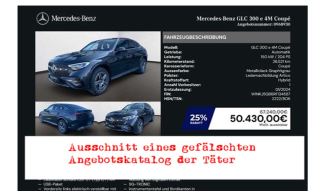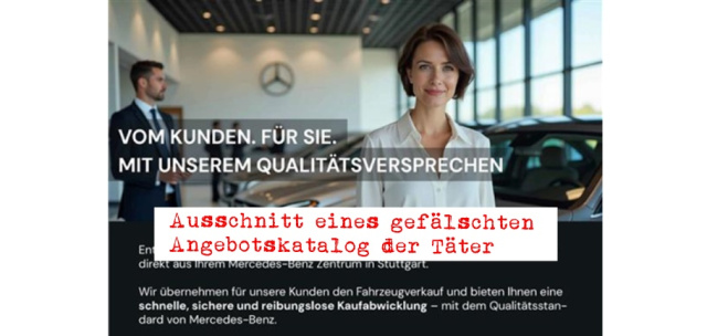 Derzeit sind hochprofessionelle Internetbetrüger am Werk, die mit erschreckender Dreistigkeit im Namen von Mercedes-Benz gefälschte Angebotskataloge, Kaufverträge und Rechnungen per E-Mail verschicken. Ziel dieser kriminellen Machenschaften ist es, gutgläubige Käufer zur Überweisung hoher Geldbeträge für Fahrzeuge zu bewegen, die in Wirklichkeit gar nicht existieren.