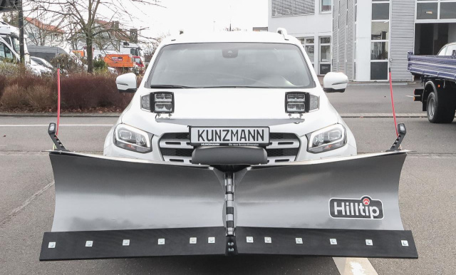 Das Autohaus Kunzmann hat die X-Klassen mit einem Schneepflug ausgestattet. Der Anbau ist dank Hilltip Quick Hitch Schnellmontage leicht an- und abbaubar. Als Basis dient die X-Klasse 250 d Power Edition mit 2.298 cm3 Hubraum, 190 PS und 4MATIC.
