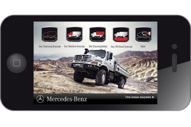 Mit dem iPhone- / iPad-App können Interessenten mit spielerischer Bedienung und einfachen Klicks viele Neuigkeiten und Wissenswertes über den MercedesBenz Zetros erfahren. Zusätzlich beinhaltet das Mercedes-Benz Zetros App viele Bilder, die den Zetros mit ganz unterschiedlichen, individuellen An- und Aufbauten im Einsatz zeigen, sowie einen lebendigen Filmtrailer.