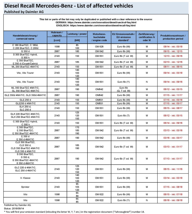 Überblick über Rückruf Daimler-Diesel-Modelle