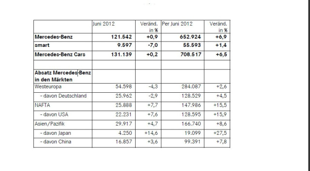 Mercedes-Benz ist weiter auf Erfolgsspur und verzeichnet im ersten Halbjahr einen neuen Absatzrekord. Von Januar bis Juni wurden insgesamt 652.924 Fahrzeuge (+6,9%) verkauft. Im Juni lagen die Verkäufe mit 121.542 Einheiten (+0,9%) leicht über dem Rekordniveau des Vorjahres. Auch für das Geschäftsfeld Mercedes-Benz Cars waren die ersten beiden Quartale 2012 die volumenstärksten der bisherigen Unternehmensgeschichte. Von den Marken Mercedes-Benz, smart und Maybach verkaufte das Unternehmen in den ersten sechs Monaten des Jahres 708.517 Einheiten (+6,5%). Dabei entfielen 131.139 Fahrzeuge auf den Monat Juni (+0,2%).