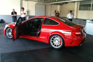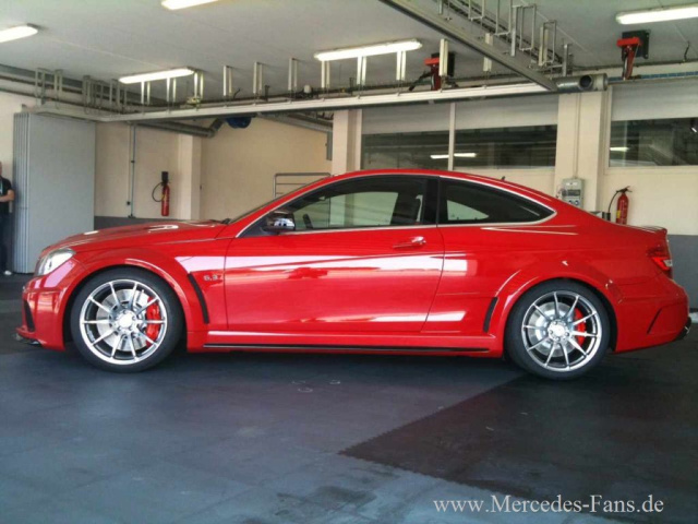 Er ist rassig. Er ist rot. Er ist heiß. Und er ist völlig ungetarnt. Der Mercedes-Benz C63 AMG Black Series zeigt sich scharf und schnittig in voller Schönheit - und zwar schon vor dem offiziellen Debüt, das für den F1 GP am Nürburgring geplant ist. Wir wissen nicht, wer die Bilder wann und wo gemacht hat. Offenbar waren es schnelle Schnappschüsse eines Anonymus, der zugegen war, als Mercedes-AMG Mitarbeiter das kommende superstarke C-Klasse Coupé in einer Garage inspizierten oder was auch immer mit dem Wagen machten. Egal. Wichtig ist nur: Dank der undichten Stelle im System haben wr die freie Aussicht auf den neuen Superstar unter den Coupés. Wie man sieht, wird der Mercedes C63 AMG Black Series 2012, der sich von einem 517 PS Aggregat antreiben lassen wird, extrem bullig, dynamisch und wuchtig ins Rollen kommen.