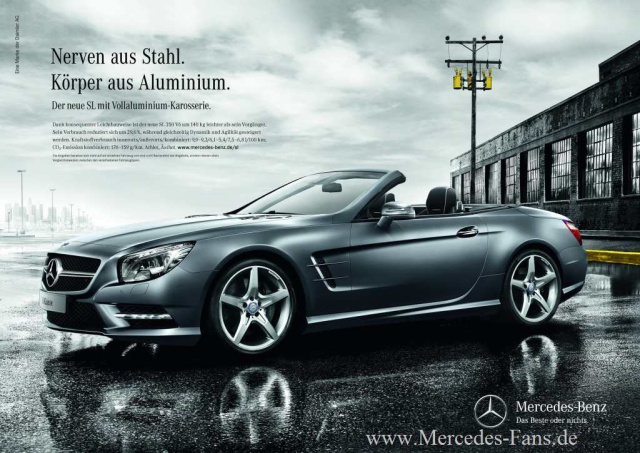 Unter dem Titel Der neue SL. Athlet. Ästhet. startet Mercedes-Benz am 12. März 2012 die Markteinführungskampagne für die sechste Generation seines legendären Luxus-Sportwagens. Verschiedene Printanzeigen im elegant-monochromen Look und ein ungewöhnlicher TV-Spot in Schwarz-Weiß mit Promi setzen die Kernbotschaft perfekt in Szene: Der SL ist die Vollendung kultivierter Sportlichkeit.