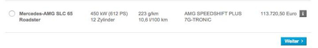 Mercedes-AMG SLC 65? Das erschien auch uns eher unwahrscheinlich und so staunten wir umso mehr, als wir von einem Leser sogar einen Screenshot bekamen, der den mysteriösen Mercedes-Roadster tatsächlich als Spitzenmodell aufführte. (Bitte beachten: Unser Titelscreenshot zeigt zr Veranschaulichung einen weißen AMG SLK 55.)