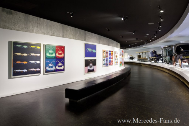 Den Auftakt bilden im Mythosraum 1 die Werke des Stuttgarter Hölzel-Kreises und die berühmte Cars-Serie von Andy Warhol im direkten Gegenüber mit den ersten Automobilen der Welt von Carl Benz und Gottlieb Daimler. Pietro Sanguinetis auto- wie kunstbezogene Wortskulpturen in Mythosraum 2 stehen im Kontext der Geburt der Wortmarke Mercedes im Jahr 1902. Der skulpturalen Präsenz der eleganten und schnellen Kompressorwagen der 1920er und 1930er Jahre im Mythosraum 3 antworten die großen, eleganten Objektbilder der Künstler John M Armleder und Anselm Reyle. Zu entdecken sind weitere Kunstwerke wie die Videos von Kirsten Mosher, eine dynamische Lichtskulptur von Andreas Schmid und die einhundert Readymades von Armleder auf der Ladefläche eines Kastenwagens. Im Mythosraum 5 überrascht eine Mimikry besonderer Art: Der Mercedes-Benz 190 ist kein normales Auto, sondern ein Kunstwerk von Bertrand Lavier. In unmittelbarer Nachbarschaft dazu die monumentalen Zeichnungen von 1990er Automodellen des Amerikaners Robert Longo. Wandobjekte von George Henry Longly und Gerold Miller setzen einen Kontrapunkt zur medial inszenierten Decke aus 10 000 LED-Lampen im Mythosraum 6. Höhepunkt und Abschluss bilden die Videoarbeiten der Schweizer Künstlerin Sylvie Fleury bei den Rennwagen und auf der Medienwand im Bereich Faszination Technik.