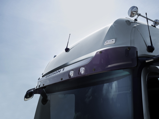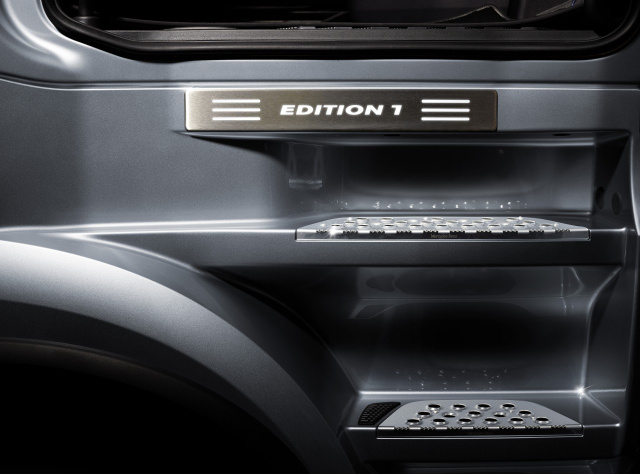 Innen wie außen sorgen umfangreiche Sonderausstattungen für einen hohen Wiedererkennungswert. Zum Beispiel das „Edition 1“ Logo in der Sonnenblende und unter dem Typenschild. Oder die vier zusätzlichen LED-Fernscheinwerfer sowie die exklusive Lackierung von Wartungsklappe und Vorbauklappe. Zum Lieferumfang gehören außerdem der beleuchtete Mercedes-Benz Stern mit schwarzer Blende und sechs Ziergitterapplikationen, während der Scheinwerferkranz abgedunkelt ist. Die MirrorCam in Chrom ersetzt wahlweise die herkömmlichen Außenspiegel, die ebenfalls bei der „Edition 1“ lieferbar sind. Von der Seite auffällig sind die Edelstahl-Einstiegsstufen. Bei Sattelzugmaschinen verzieren Edelstahl-Kiemen die Seitenverkleidung. Die Hinterachskappen bzw. Hinterachstöpfe sind ebenfalls in Edelstahl mit Radmutterschutzkappen VA+HA ausgeführt.
