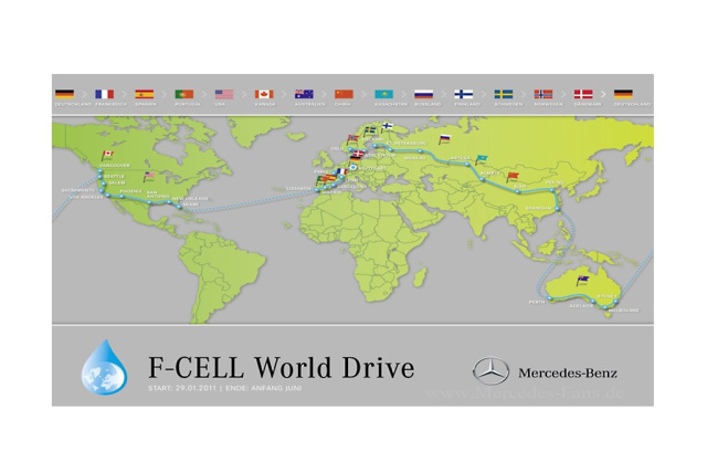 Ende Januar gibt Mercedes-Benz den Startschuss für eine weltweit bislang einmalige Langstreckenfahrt, den F-CELL World Drive. Das gab der Stuttgarter Automobilbauer auf der North American Auto Show in Detroit bekannt. Mit der B-Klasse F-CELL, dem ersten in Serie gefertigten Brennstoffzellenfahrzeug, umrundet Mercedes-Benz die Welt. Ziel des F-CELL World Drive ist es, die Leistungsfähigkeit und Alltagstauglichkeit der Brennstoffzellentechnologie zu beweisen und gleichzeitig für den Aufbau eines globalen Wasserstoff-Tankstellennetzes zu werben. Um die technische Reife der Brennstoffzellentechnologie zu demonstrieren, die bereits heute lokal emissionsfreies Fahren im Alltagsbetrieb und auf Langstrecken ermöglicht, startet der Erfinder des Automobils am 30. Januar den F-CELL World Drive mit der B-Klasse F-CELL: 125 Tage lang, über vier Kontinente, durch verschiedenste Klimazonen und auf unterschiedlichsten Strecken von Asphalt bis hin zu unbefestigten Straßen. Mit dieser einzigartigen Weltumrundung unterstreichen wir die hohe technische Reife unserer Elektrofahrzeuge mit Brennstoffzelle. Mit rein batterie-elektrischen Fahrzeugen wäre ein solches Vorhaben nicht möglich, erklärt Dr. Thomas Weber, im Vorstand der Daimler AG verantwortlich für Konzernforschung und Mercedes-Benz Cars Entwicklung. Ähnlich wie bei der Erfindung des Automobils vor 125 Jahren stellt sich auch heute wieder die Frage nach einer entsprechenden Tankinfrastruktur. Aber ich bin zuversichtlich, dass wir auch hier zusammen mit allen Beteiligten eine Lösung finden werden um das große Potential dieser Technologie voll auszuschöpfen.
