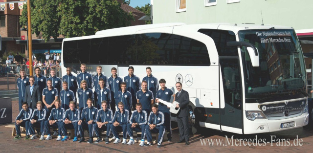 "Wenige Tage vor dem ersten WM-Qualifikationsspiel gegen die Färöer Inseln hat Mercedes-Benz in Barsinghausen den neuen Mannschaftsbus an die deutsche Nationalmannschaft übergeben. Künftig wird das Team von Bundestrainer Joachim Löw von einem Mercedes-Benz Travego Edition 1 zu den Partien gefahren. Seinen ersten Einsatz hat der Bus vor dem ersten WM-Qualifikationsspiel gegen die Färöer am 7. September in Hannover. Der exklusive Premiumhochdecker ist das neue Aushängeschild von Mercedes-Benz Omnibusse. Als unser aktuelles Spitzenmodell verfügt er nicht nur über eine besonders komfortable Ausstattung, sondern setzt auch bei Sicherheit und Umweltfreundlichkeit Maßstäbe, sagt Hartmut Schick, Leiter Daimler Busse.