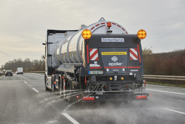 Als präventives Mittel gegen Glatteis nutzte die Autobahn GmbH eine Sole aus Wasser und Salz als umweltfreundlichere Alternative zu konventionellem Streusalz. Der Solesprüher-Auflieger ermöglicht das Ausbringen der Sole bei Geschwindigkeiten von 80 km/h im laufenden Verkehr bis zu einer Streubreite von 12 Metern. Angetrieben wird der Streuer über das hintere Rad des Sattelaufliegers autark vom Zugfahrzeug. Die Steuerung des Solesprühers erfolgt kabellos über eine Funkfernbedienung. Die Erprobung hat gezeigt, dass Einsätze bei der präventiven Soleausbringung im Winterdienst mit E-Lkw bewältigt werden können.