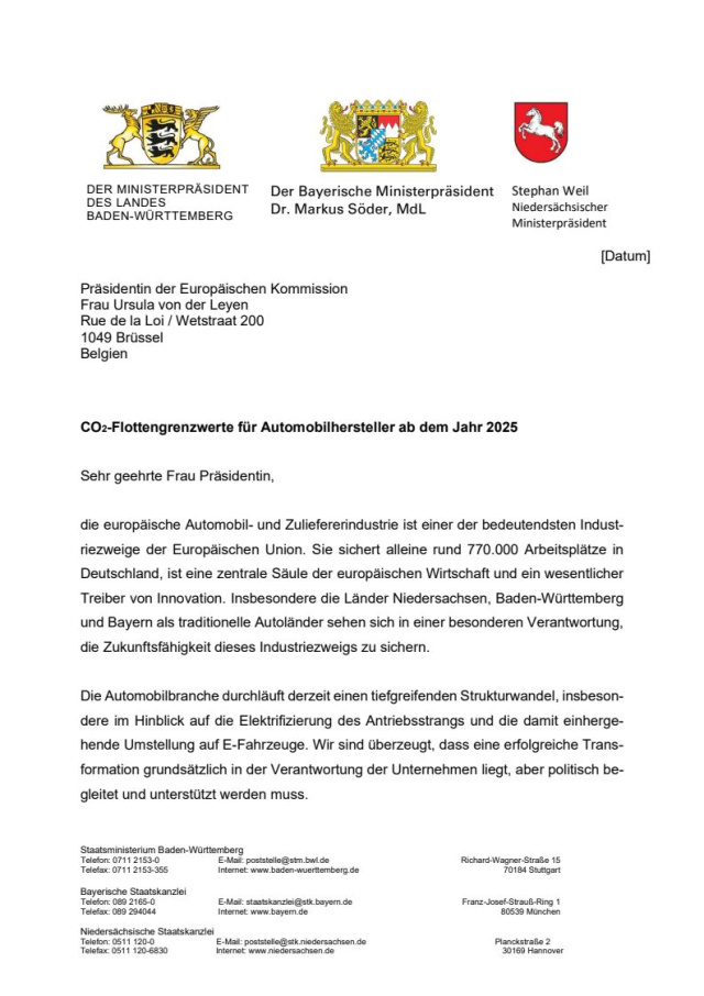 Die Sorge, dass Deutschland bald kein Autoland mehr ist, treibt auch die Ministerpräsidenten der Autoproduktion-Bundesländer Bayern, Baden-Württemberg und Niedersachsen um. Ihre drei amtierenden Ministerpräsidenten Söder (CSU), Kretschmann (Grüne) und Weil (SPD) suchen nun über Parteigrenzen hinweg den Schulterschluss und machen in einem gemeinsamen Schreiben an die EU-Kommissionspräsidentin Ursula von der Leyen ihre Position deutlich: Eine zukunftsweisende Transformation der Branche erfordert innovationsfreundliche Rahmenbedingungen und einen realistischen Zeitplan.