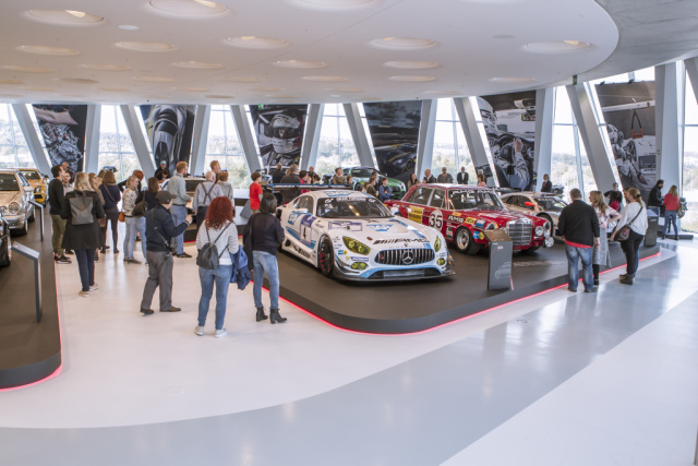 sowie im Atrium des Museums das AMG GT S DTM Safety Car.