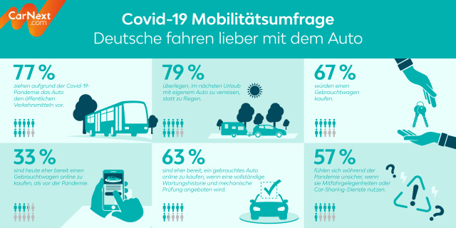 CarNext.com, ein Online-Marktpatz für Gebrauchtwagen, hat die Ergebnisse einer aktuellen Covid-19 Mobilitätsumfrage veröffentlicht. Die Umfrage ergab, dass 77 Prozent der Befragten in Deutschland aufgrund der Pandemie nun eher das Auto anstelle von öffentlichen Verkehrsmitteln nehmen.