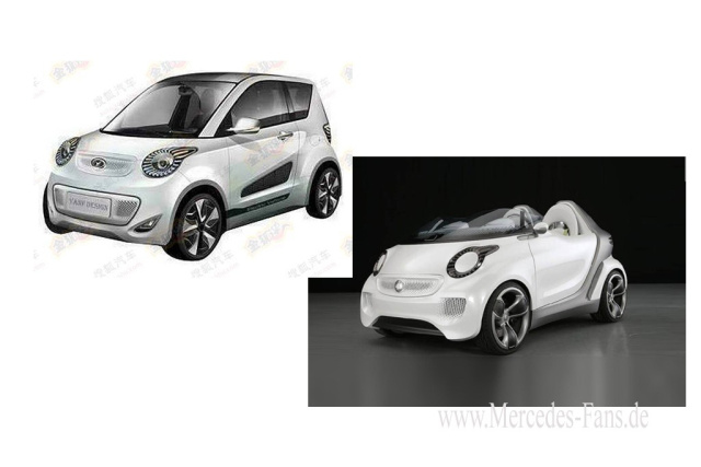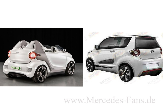"Es gibt nichts Gutes - außer man tut es", sagt der Volksmund. Und wenn einem selber nix Vernünfftiges einfällt? Dann kann man mit einer Imitation eines guten Vorbilds nichts falsch machen. "Gut geklaut ist besser als schlecht komponiert", lautet seit jeher der Wahlspruch der Plagiateure in den Kreativabteilungen. Da wird mal mehr mal weniger abgekuckt. Und manchmal so richtig frech und dreist, dass einem die Spucke wegbleibt. Aktuelles Beispiel ist die China Kopie der 2011 auf dem Auto Salon in Genf gezeigten smart Elektrostudie "forspeed".