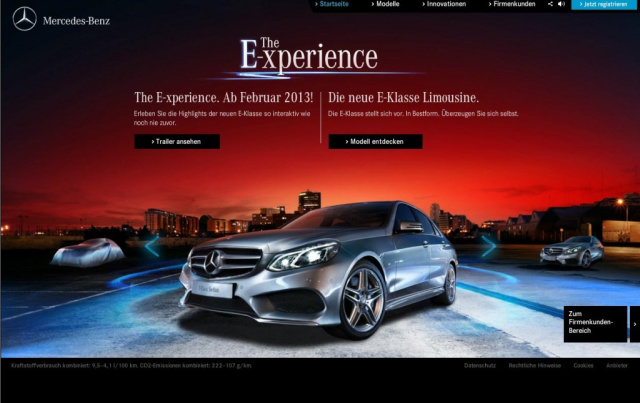 "The Experience" heißt das Webspecial, das eigens für die neue E-Klasse von Mercedes-Benz eingerichtet worden ist. Das Webspecial bietet alle Infos zur kommenden E-Klasse-Generation sowie die Möglichkeit der Broschürenbestellung. Darüber hinaus kündigt das Webspecial mit einem Trailer eine Entdeckungstour zur neuen E-Klasse an. "The Experience" heißt dieses Schau, die im Februar 2013 online geschaltet werden wird, und über reizvolle wie vielfältige interaktive Funktionen verfügen soll.