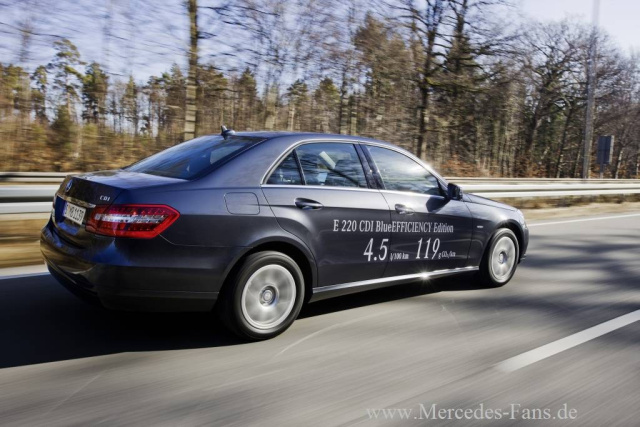 Eines der sparsamsten Autos in seinem Segment ist der ab März 2012 erhältliche E 220 CDI BlueEFFICIENCY Edition. Dank zahlreicher Effizienz steigernder Maßnahmen wie Aerodynamik-Paket, elektrische Servolenkung (EPS), längerer Hinterachs-Übersetzung sowie rollwiderstandsarmen Reifen im Format 205/55 R 16 emittiert das Modell 119 g CO2/km zehn Gramm oder fast acht Prozent weniger als bisher. Das entspricht 4,5 Liter Diesel auf 100 km. Der E 220 CDI BlueEFFICIENCY Edition leistet 125 kW (170 PS) und ist ausschließlich mit 6-Gang-Schaltgetriebe verfügbar.