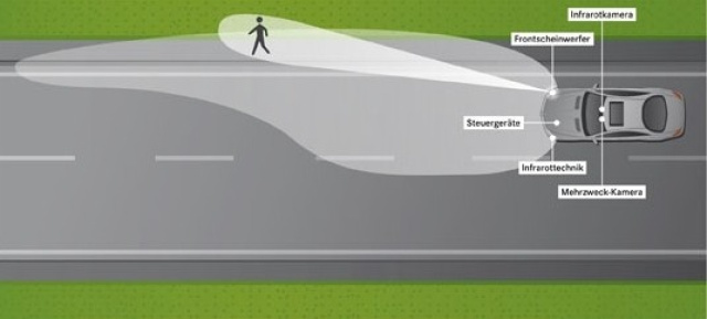 Der Nachtsicht-Assistent PLUS mit neuer Spotlight-Funktion erfordert ein komplexes Zusammenspiel verschiedener technischer Funktionen. Infrarotscheinwerfer, Nachtsichtkamera, Mehrzweck-Kamera, Spotlight-Scheinwerfer, Instrumentendisplay und Scheinwerferschalter werden von mehreren Steuergeräten mit komplexer Software koordiniert.
