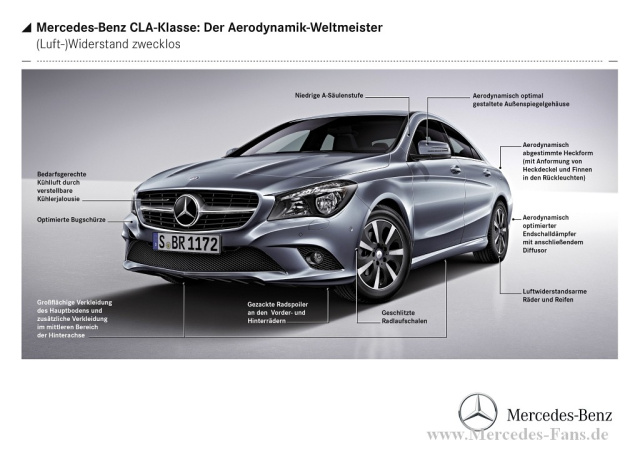 Weil Autos unter anderem aus Gründen des Komforts aber immer breiter und höher werden, sind den Aerodynamikern hier die Hände weitestgehend gebunden. Das Luftwiderstandmaß beschreibt, wie effizient ein Fahrzeug durch den Wind gleitet, es wird errechnet als Produkt aus Luftwiderstandsbeiwert und Stirnfläche eines Fahrzeugs. Und da der Beiwert dimensionslos ist, wird das Luftwiderstandsmaß angegeben in m². Im Falle des Aerodynamik-Weltmeisters CLA bedeutet dies: Die Luftwiderstandsfläche cw x A, liegt mit 0,51 m2 ebenfalls an der Spitze und deutlich unter vielen Kleinwagen. Als CLA 180 BlueEFFICIENCY Edition wird dieser Bestwert sogar noch einmal unterboten, beim Luftwiderstand knackt das viertürige Coupé eine magische Grenze: Er beträgt nur 0,49 m².