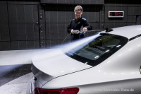 Im Fokus steht also der dimensionslose Luftwiderstandsbeiwert cw: Er ist das Maß für die aerodynamische Formgüte eines Körpers und damit auch eines Automobils. Mit einem cw-Wert von 0,23 erreicht hier der Mercedes-Benz CLA eine neue Bestmarke sowohl innerhalb der Mercedes Modellpalette als auch unter allen Serienfahrzeugen. Der CLA 180 BlueEFFICIENCY Edition unterbietet diesen Bestwert sogar noch einmal. Hier lautet der cw-Wert 0,22. Doch entscheidend für den Luftwiderstand ist keineswegs der cwWert allein. Denn zweite bestimmende Größe ist die Stirnfläche des Fahrzeugs, seine Querschnittsfläche in Strömungsrichtung. Früher wurde die Stirnfläche ermittelt, indem der Schatten des Körpers mit einer sehr weit entfernten Lampe auf einen durchsichtigen Schirm projiziert wurde. Dann malte man den Umriss ab und errechnete aus den einzelnen Segmenten die Gesamtfläche. Heute wird die Stirnfläche mit Laserlichtschranken abgetastet.