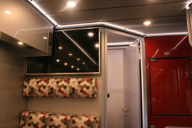 Von Hartmann Spezialkarosserien stammt die 3.900 mm lange Wohnkabine in robuster Sandwich-Leichtbauweise. Der Aufbau selbst ist 2.100 mm breit und ebenso hoch, die Gesamthöhe des Reisemobils liegt bei 3.300 mm. Im Heckbereich ist die Kabine angeschrägt, so sind auch weiterhin gute Geländeeigenschaften gesichert. Von beiden Fahrzeugseiten aus ist über Außenstauklappen ein großer Stauraum im Heck zugänglich.