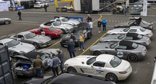 Neben den reinrassigen Rennwagen, die sich die Stirn boten, durften auch Fahrzeuge mit Straßenzulassung der Markenclubs auf die Strecke. In den Präsentations und Gleichmäßigkeitsläufen, wie zum Beispiel vom Mercedes-Benz SLS Club waren natürlich weitere Mercedes Fahrzeuge zu finden, die Ihr in der Fotostrecke findet. Christian Pfessdorf, der sonst seinen Mercedes-Benz 300 SL gnadenlos feuer spuckend, aber mit viel Popometer und Fingerspitzengefühl in Rennen durch die Eifel prügelt, war dieses Jahr mit einer anderen Waffe am Start. Er führte das Feld des SLS Clubs mit seiner Rennversion des SLS an, was ihm sichtlich Spaß machte.