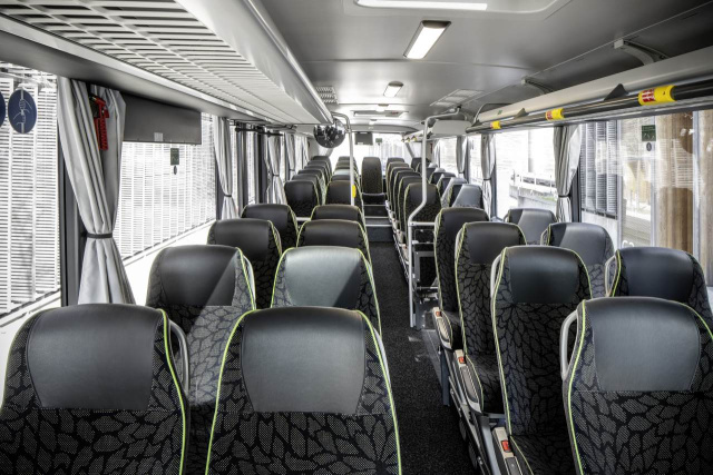 Das Premierenmodell ist gleichzeitig elegant, funktionell und praxisnah eingekleidet und ausgestattet. Karosserie und Anbauteile sind in Anthrazit-Metallic gehalten. Die zweiflügelige Tür zwei sichert einen schnellen Fahrgastwechsel an Haltestellen. Die multifunktionelle Sondernutzungsfläche gleich gegenüber ist mit vier Klappsitzen ausgestattet. Hohen Komfort auch auf längeren Strecken bietet die komfortable Bestuhlung Travel Star Eco mit verstellbaren Rückenlehnen, Sitz- und Lehnflächen Bezug in Tiffy-Grau, Kedern in Maigrün sowie tiefschwarzen Kopfteilen aus dem Lederfasermaterial Composition. Vorhänge an den Fenstern und eine Seitenwandverkleidung in Nadelvlies tragen ebenso zum angenehmen Ambiente an Bord bei wie der grau gemusterte Boden. Mit Fahrtzielanlage, Fahrgast-Signalanlage, der Vorbereitung für den Einbau eines Fahrscheindruckers und einem Aufnahmedorn für eine Zahlkasse ist der Intouro K gleichzeitig auf den Linienverkehr eingestellt. Vom MediaRouter für Internetzugang und Streaming profitieren Fahrgäste mit ihren Endgeräten bei allen Einsätzen.