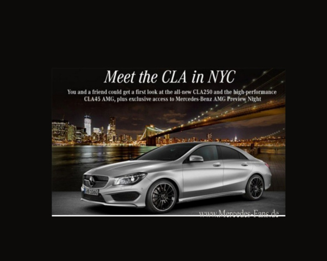 Der neue Mercedes CLA ist da. Jetzt wartet die Welt auf die dynamisierte Fassung des viertürigen Kompaktcoupés. Wird Mercedes-Benz den CLA 45 AMG bereits auf dem Auto Salon in Genf 2013, der am 7.März offiziell beginnt, zeigen? Ganz sicher wird 350 PS starke Mercedes CLA AMG auf der New York International Auto Show (29.03.-07.04.) zu sehen sein - wie ein Werbehinweis von Mercedes-Benz USA anlässlich eines Gewinnspiels zur Präsentation des neuen Mercedes CLA verrät.
