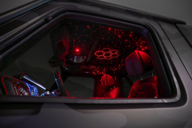Die inneren Werte zeichnen sich durch einen ein aufwendig in Leder gehülltes Interieur mit einem sehr speziell inszenierten und von vielen roten Leds illumninierten Sternenhimmel aus.