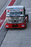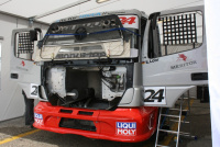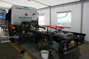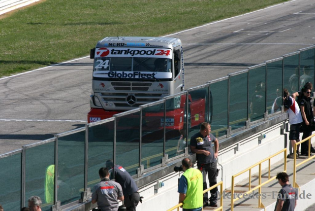 Als Hintergrundinfo vielleicht nochmal folgendes: der Truck (ex Österreich von 2007) ist eigentlich mit einem Mercedes Rennmotor der letzten Generation ausgestattet. Allerdings ist uns sehr schnell aufgefallen, dass das dazugehörige Steuergerät alles andere als letzter Stand ist. Da fehlen einige Pferdchen im Stall. Beim ersten Rennen gab's dann noch ein kleines Temperaturproblem dazu. Das haben die Mechaniker inzwischen im Griff, aber dadurch gab es im ersten Renneinsatz für mich leider nur 1,6 bar Ladedruck. Zum Vergleich: in der Saison 2007 fuhren die Jungs mit 5,5 bar! Im zweiten Rennen hatten wir dann 2,4 bar zur Verfügung. Tendenz steigend. Nichtsdestotrotz ist uns allen klar, dass da noch ne Menge Arbeit auf uns wartet.