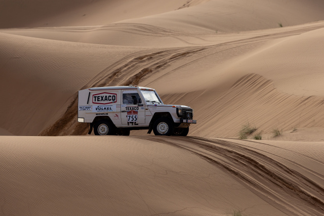 Wer nun glaubt, dass die Rally Dakar Classic mehr oder weniger eine gemütliche Kaffeefahrt für historische Rallye-Fahrzeuge ist, der wandelt auf dem Holzweg. Der 280GE im Look des Rally Paris Dakar-Siegers von 1983, damals pilotiert von Jackie Ickx, musste 2024 ziemliche Nehmerqualitäten beweisen. So gesehen traf es sich ganz gut, dass der Teamsponsor VÖLKEL aus der Werkzeugbranche kommt und spezialisiert auf Gewindewerkzeuge ist. Doch mehr als eine gebrochene Stoßdämpferaufnahme vorn mussten die Mechaniker nicht in den Griff bekommen.