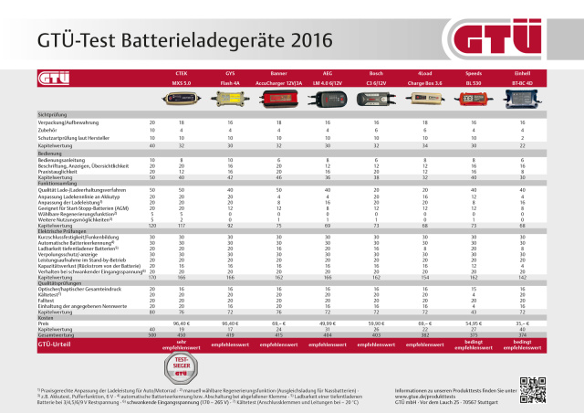 Damit es nicht soweit kommt, rät die Gesellschaft für Technische Überwachung (GTÜ), stets auf einen funktionsfähigen und voll geladenen Akku zu achten. Wer hier vorbeugen will, dem empfehlt die Stuttgarter Sachverständigen- und Prüforganisation Ladegeräte zum Anschluss an die heimische Steckdose. Die halten die Batterie über Jahre hinweg fit und sind nicht teuer. Schon für deutlich weniger als 100 Euro gibt es Spitzengeräte zur einfachen Anwendung, wie der letzte GTÜ-Batterieladertest 2016 gezeigt hat. Empfehlenswerte Produkte sind demnach ab 50 Euro zu haben.