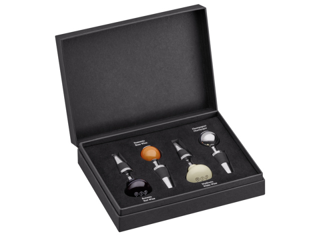 Ein tolles Geschenk für Weinliebhaber. Das praktische Weinverschluss-Set präsentiert sich in ausgefallener Schaltknaufoptik, wobei ein Verschluss an die Form des 300 SL Schaltknaufs angelehnt ist. Zwei unterschiedliche Größen sind in dem 4er-Set enthalten, sodass für jede Weinflasche ein passender Verschluss bereitsteht. 3 Weinverschlüsse sind mit Holzkopf, 1 Champagnerverschluss mit Edelstahlkopf. In der dekorativen grauen Aufbewahrungsbox mit Mercedes-Benz SL Foto in der Deckelinnenseite kommen die Verschlüsse in den Farbtönen Rot, Weiß und Silberfarben auf ansprechende Art und Weise zur Geltung.