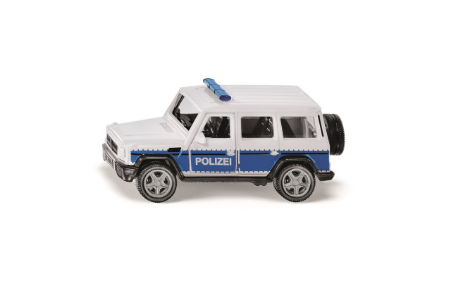 Zwölf Zylinder, 600 PS: Mit der leistungsstärksten Variante des G-Modells ist die Bundespolizei auch auf schwierigstem Gelände einsatzfähig. Die markante und bullige Erscheinung des Geländewagens wird durch die typische weiß-blaue Farbgebung der Bundespolizei betont. Die beiden vorderen Türen und die Hecktüren lassen sich an dem Fahrzeug öffnen, außerdem können die Räder abgenommen werden. Das G-Modell ist eine kräftige Zugmaschine. An der Anhängerkupplung können deshalb zusätzlich SIKU Anhänger gezogen werden.