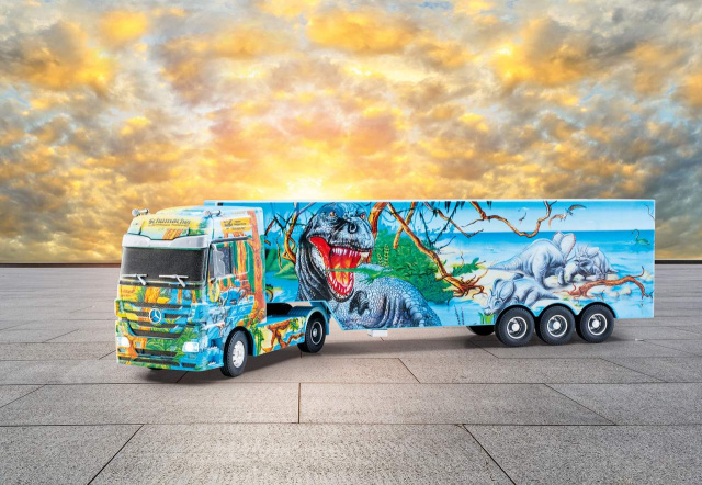 Bei Revell Control geht der ferngesteuerte Mercedes-Benz Actros Dino Express Truck auf Entdecker-Tour. Er ist im aufwändigen Airbrush-Design bedruckt und sieht mit seinem detailreichen Dino-Look einfach super aus. Der lizenzierte Truck ist außerdem mit LED-Beleuchtung ausgestattet und damit auch bei Ausflügen in der Dämmerung ein Blickfang. Der 49 cm lange Truck im Maßstab 1:32 bringt sowohl draußen als auch drinnen Dino-Flair ins Abenteuer und ist ein Must-Have für Saurier-Bändiger. Dank authentischem Motorsound ist der Fahrspaß mit bis zu 10 km/h noch größer. Der stylische Auflieger kann an- und abgekoppelt werden.