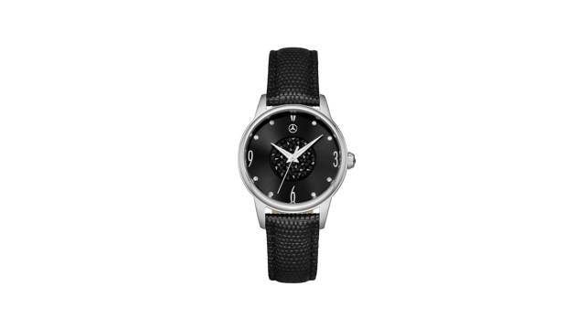 Die elegante Quarzuhr mit hochwertigem Gehäuse aus Edelstahl setzt stilvolle Akzente an jedem Handgelenk. So wird das schwarze Zifferblatt nicht nur von einem Mercedes Stern, sondern auch von acht Swarovski® Kristallen als Stundenindex, weißen gedruckten Ziffern sowie schwarzen Swarovski® Crystal Fine Rocks im Zentrum verziert. Gehärtetes und entspiegeltes Mineralglas sorgt für den nötigen Schutz, während silberfarbene Zeiger mit Super-LumiNova®-Leuchtmasse sowie das schwarze Kalbslederarmband den gelungenen Auftritt perfekt abrunden. Durchmesser: 37 mm. Wer heute kein Losglück haben sollte, kann die Damenuhr im Online-Shop von Mercedes-Benz Customer Solutions HIER für 119,90 € bestellen.