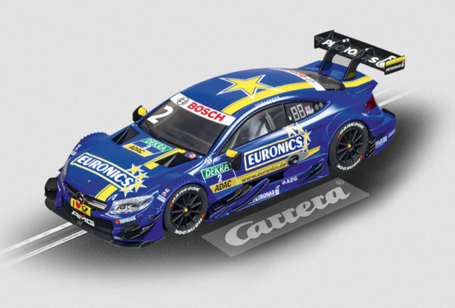 DTM - ein neuer Siegertypus für Carrera DIGITAL 124: Mit dem Mercedes AMG C 63 DTM bringt Carrera 2017 erstmals die DTM im großen Maßstab auf die Strecke und erfüllt so vielen Carerra Fans einen langersehnten Traum. Mit dem Britten Gary Paffett sitzt ein echter Profi hinter dem Lenkrad des Rennboliden mit der Startnummer #2. Und auch optisch besticht das Rennfahrzeug mit V8-Motor durch sein sportliches Design sowie dem typischen AMG Twin Blade Grill. Man kann gespannt sein, welchen Hersteller Carrera als künftigen DTM Gegner nachziehen wird...