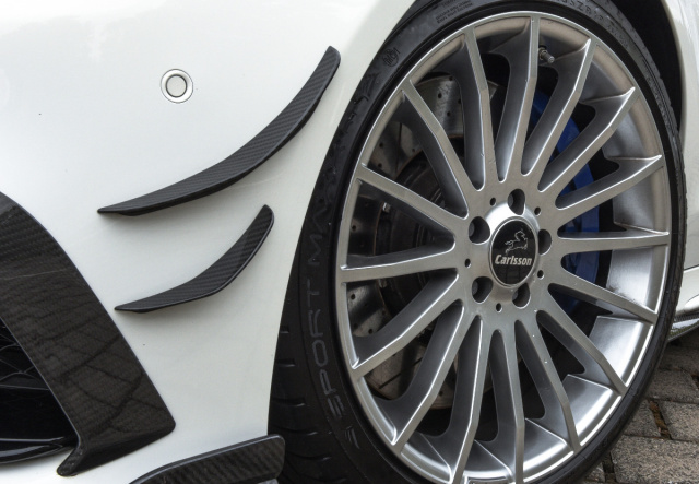 Dank aerodynamik-Kit aus hochwertigen Echtcarbonteilen deutet der scharfe CC63S optisch auf Rennsportler mit Straßenzulassung hin. Aggressiv wirken dabei vorallem die Carlsson-Frontspoilerlippe und die mächtigen Luftführungsschächte. Ebenfalls im ultraleichten Werkstoff gehalten sind die Kotflügelaufsätze, die durch die markanten Luftauslasscover an der Heckschürze in der Linie wieder aufgenommen werden. Der Heckspoiler auf dem Kofferraumdeckel erhöht den Anpressdruck auf die Straße und verbessert die Fahrdynamik des Spitzensportlers. Für den richtigen Klang sorgt eine Edelstahl Sport-Abgasanlage die über eine manuelle Klappensteuerung verfügt.