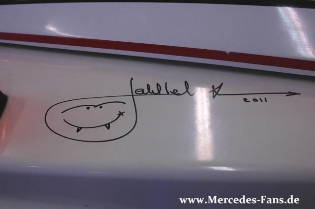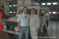 Als Jackie Ickx im Rahmen einer Autopräsentation zufällig zeitgleich mit dem 280 GE am Nürburgring weilte, ergriff Jörg Sand die Gelegenheit beim Schopf: "Jackie war völlig begeistert, dass wir das Auto so nah am Original wieder aufgebaut hatten! Das war für ihn überhaupt keine Frage, dass er den "G" sofort mit seiner Unterschrift versehen würde!", so Jörg Sand. (rechts im Bild mit Jackie Ickx)