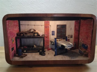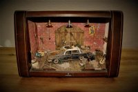 Das sehen wir auch nicht alle Tage. Modellbau für Fortgeschrittene. Diese Modellbauszenen von Künstler Roland Most sind immer in einem Gehäuse eines alten Röhrenradios oder Fernsehers eingebaut und immer im Maßstab 1:18. Die schönen Szenen werden von Hand und im Detail selber hergestellt. Lediglich die Modellautos sind nicht aus der „Eigenproduktion“. Das Altern und Rosten wiederum kommt aus der Hand von R. Most.