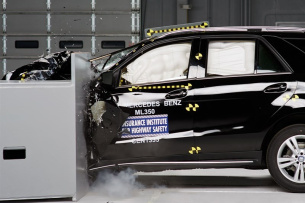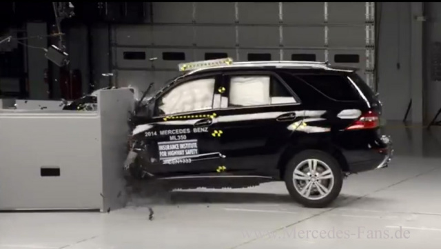 Beim aktuellen IIHS-Crashtest mit einem Mercedes ML 350 gab's für das Mercedes SUV die Top-Bewertung "Safety Pick+" Diese Bewertung bekommt ein Fahrzeug nur, wenn es in mindestens vier von fünf Kriterien (Aufprall vorn schräg, Aufprall vorn, Aufprall seitlich, Dachstabilität, Insassenschutz) ein Resultat mit der Note "Gut" erreichen könnte. Die Mercedes M-Klasse hat sogar in allen fünf Disziplinen die Note "Gut" erhalten. (Bilder: IIHS)