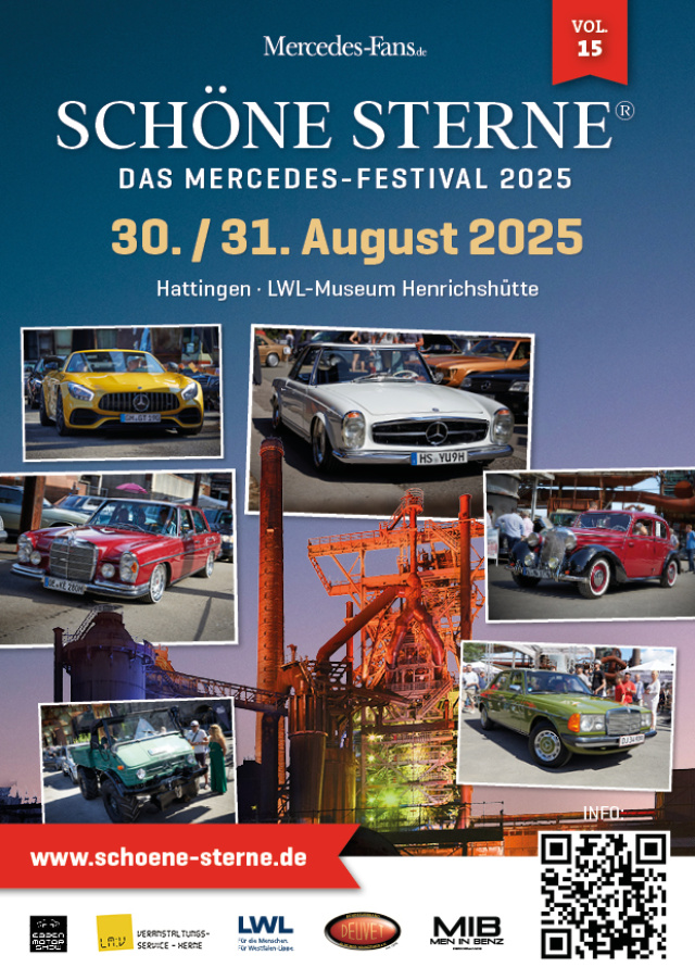 Am Samstag, 30. und Sonntag, 31. August 2025 findet das SCHÖNE STERNE Mercedes-Festival erneut auf dem Gelände des LWL-Museum Henrichshütte Hattingen statt!