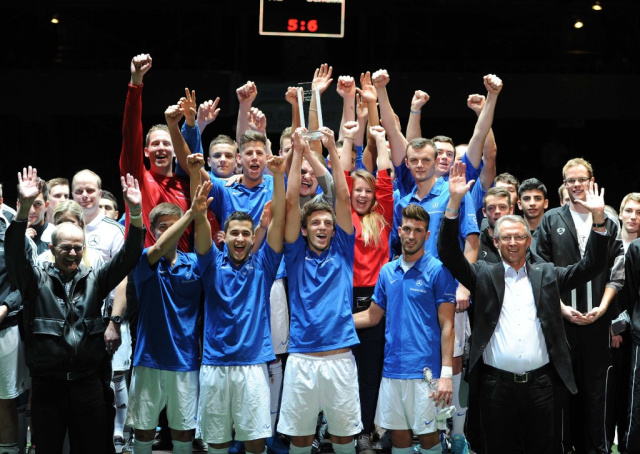 Eine tolle Sache ist auch die Integratiuon der Auszubildenden-Mannschaften, die bei dieser Gelegenheit auch einmal vor einer ausverkauften Halle kicken konnten. Das Turnier der Auszubildenden gewann schließlich das Werk Sindelfingen durch ein 5:1 im Finale gegen das Werk Bremen. Die Sindelfinger stellten mit Fabio Abbruzzese gleichzeitig auch den besten Spieler des Turniers. Dritter wurde EvoBus Ulm vor dem Werk Untertürkheim.