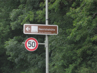 Nachdem die Straße die Ortschaft verlässt und breiter ausgebaut ist, heißt es aufpassen: Das große gelbe Bundestraßenschild mit "Gesamtverkehr rechts" über dem braunen "Route der Industriekultur"-Schild "Henrichshütte" weist die Abbiegung aus - jetzt rechts abfahren!