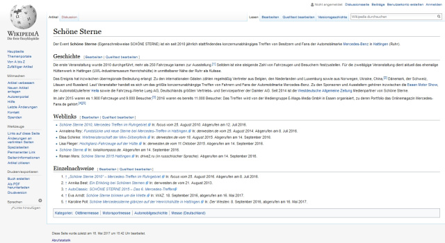 Das große Mercedes-Event SCHÖNE STERNE ist nun auch bei WIKIPEDIA zu finden. Wikipedia ist eine freie Online-Enzyklopädie, bei der sogenannten Wikipedia-Autoren („Wikipedianer“) Artikel zu relevanten Themen und Personen anlegen.