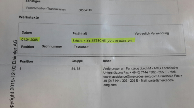 Diese S-Klasse S600 der Baureihe 221 wurde zum Amtsantritt von Dr. Zetsche im April 2006 speziell für ihn gefertigt. Um die nicht serienmäßigen Sondereinbauten zu rechtfertigen und um die pünktliche Auslieferung zu gewährleisten, wurde das Fahrzeug in den Papieren mit dem Zusatz "VV Dr. Zetsche" (VV=Vorstandsvorsitzender) versehen. Vor Auslieferung wurde bei AMG in Affalterbach die Motorsoftware überarbeitet und die Höchstgeschwindigkeit auf 300 km/h angehoben. Der ursprüngliche, originale 19-Zoll-AMG-Felgensatz ist auf den Bildern zwar nicht aufgezogen, soll aber noch vorhanden sein.