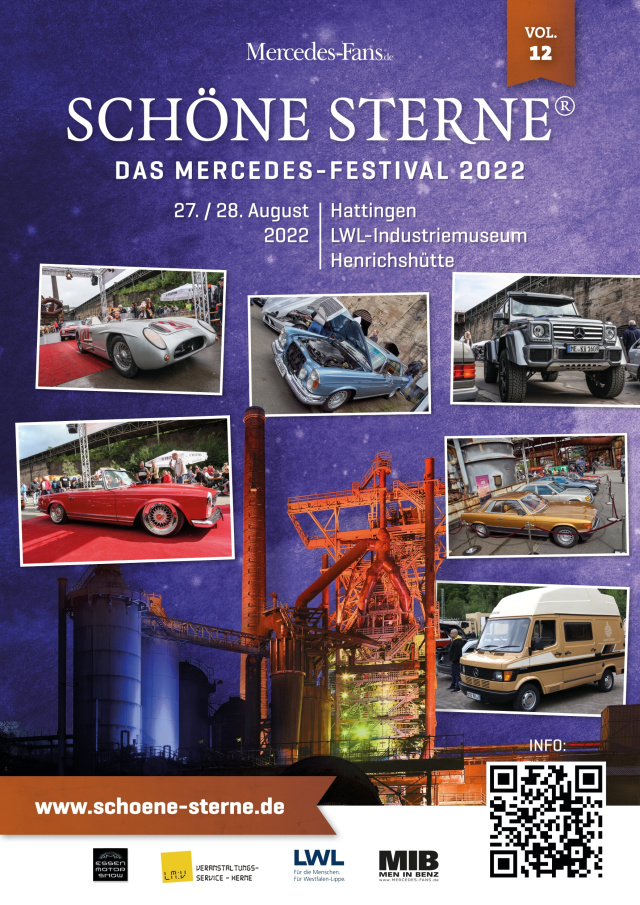 Im Jahr 2022 findet das große Mercedes-Festival SCHÖNE STERNE® zum 12. Mal statt. Am 27./28. August 2022 wird SCHÖNE STERNE® wieder in Hattingen auf dem Gelände des LWL-Industriemuseums Henrichshütte zu Gast sein.