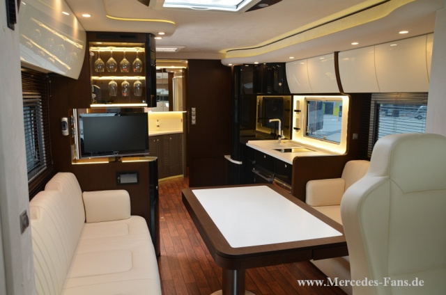 In punkto Einrichtung stehen bei der Wahl der Möbel besonders seltene und edle Echtholzfurniere zur Auswahl wie beispielsweise Amerikanische Kirsche, Nussbaum, Palisander oder Räuchereiche. Wir setzen um, was immer der Kunde sich in seinem Reisemobil wünscht, erläutert Baumgartner. Gleiches auch für die Gestaltung des restlichen Wohnbereichs sowie für das Schlaf-Appartement.