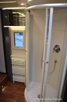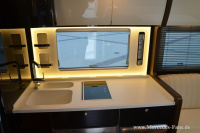Hohe Decken und eine große Grundfläche sorgen für maximale Bewegungsfreiheit im Fahrzeuginneren und zaubern eine Atmosphäre wie in den eigenen vier Wänden. Durch den auf Knopfdruck gesteuerten Slideout erreicht der Salon eine Breite von insgesamt drei Metern. Hier befindet sich die vollausgestattete Küche, ein Premiumbad mit separatem Toilettenraum und wenn gewünscht eine mit Musik und Beleuchtung untermauerte Infrarot-Sauna.
