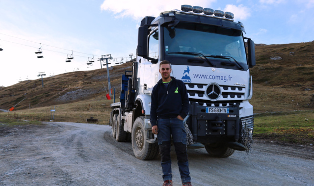 Arbeiten in der Höhe, das ist der Job von Antoine Apertet und seinem Mercedes-Benz Arocs 3351. Zusammen erledigen die beiden einen eher seltenen Job: die Installation und Instandsetzung von Skiliften... im Sommer. Im Winter müssen diese schließlich laufen. Das Unternehmen COMAG mit Sitz in Albertville ist bekannt für seine Spezialisierung auf Seiltransportsysteme, insbesondere Skilifte und Seilbahnen.